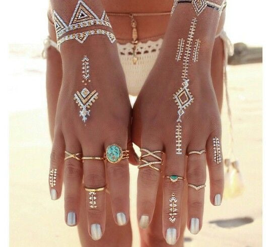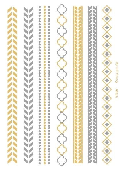 Luce un look único y radiante con estos hermosos tatuajes temporales metálicos, también conocidos como Flash Tattoos. Inspirados en joyería boho y tribal, son el accesorio perfecto para resaltar tu piel con un toque dorado o plateado.
