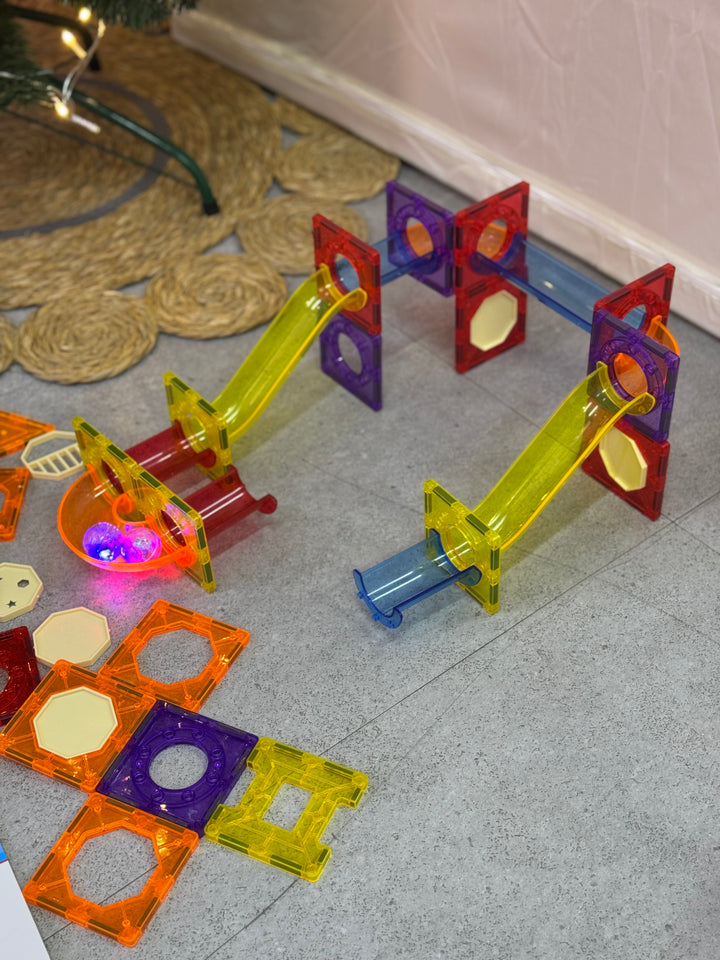 Las piezas translúcidas de colores brillantes y los imanes de alta calidad facilitan un armado estable y seguro, ideal para que los niños experimenten libremente con formas, gravedad, velocidad y movimiento.