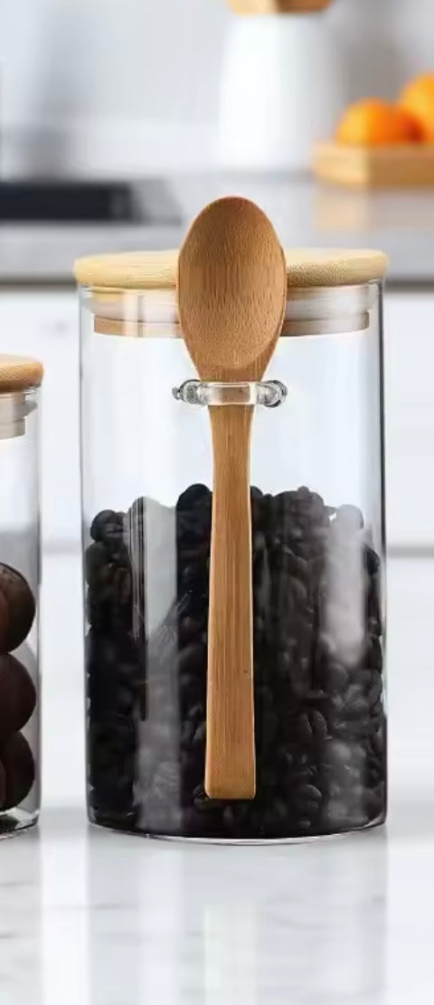 Este elegante recipiente de vidrio con tapa de bambú es perfecto para almacenar tus alimentos secos, como pasta, cereales, granos, y más. Su diseño moderno y transparente permite ver el contenido fácilmente, mientras que la tapa hermética garantiza que tus productos se mantengan frescos por más tiempo. Además, incluye una cucharita de bambú que se adapta perfectamente al recipiente, facilitando el acceso a tus alimentos.